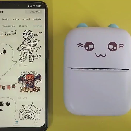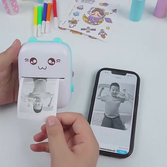 Mini Imprimante thermique de poche "chat mignon". Pour imprimer tout ce que vous voulez depuis votre smartphone ou votre tablette, il vous suffit de le connecter bluetooth. Cette imprimante n'a pas besoin d'encre, puisque c'est grâce à la chaleur que l'impression se fait. Il ne faut mettre que des rouleau de papier compatibles dans l'appareil, c'est à dire uniquement du papier thermique. Une méthode simple pour vérifier si vous y mettez le bon type de papier est d'appuyer avec votre ongle en essayant de laisser une marque, si celle-ci marque un trait gris foncé comme vous l'auriez fait avec un crayon de papier, vous avez bien un rouleau de papier thermique.